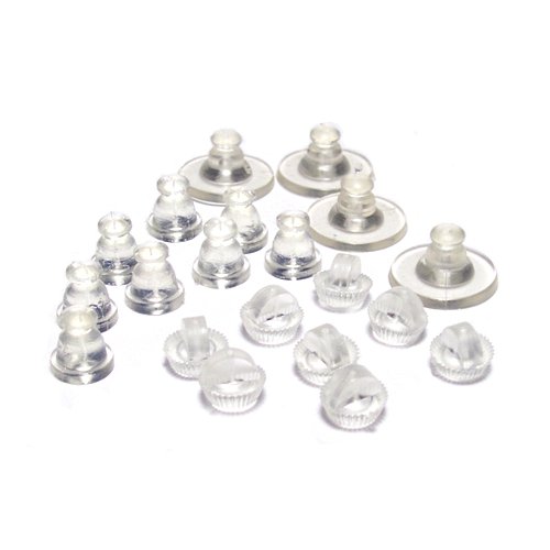 Replace your earring scrolls or metal bullet backs with these soft, comfortable and secure plastic earring backs. Say goodbye to loose stud earrings. 10 pairs. Made with clear soft plastic. 4 pairs of soft bullet earring backs. 4 pairs of button earring backs. 2 pairs of large disc earring bullet backs. Comfortable, soft and secure.