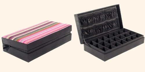 Superb quality lined earring, bead and cufflink box in striped design with black trim. Made from polyester, these earring boxes have a traditional lid which hinges open to reveal 21 sections for storing earrings or cufflinks along with several elasticated pockets under the lid. Equally suited to home or travel use, this is a beautiful way to store and protect your beads, earrings and cufflinks. Size 22cm L x 11cm W x 5cm High, each earring section is approximately 3cm square by 3 cm deep. Matching jewel roll available.