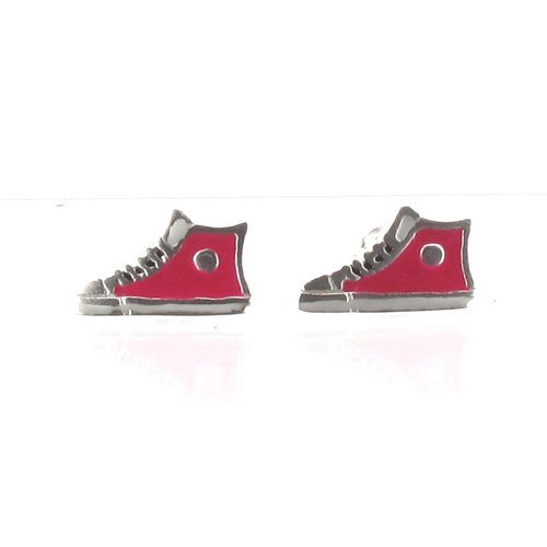 Sterling silver and pink enamel basketball boots stud earrings. 10mm x 5mm, 12mm post length. Sterling silver friction back fastening. Supplied in an organza gift pouch.